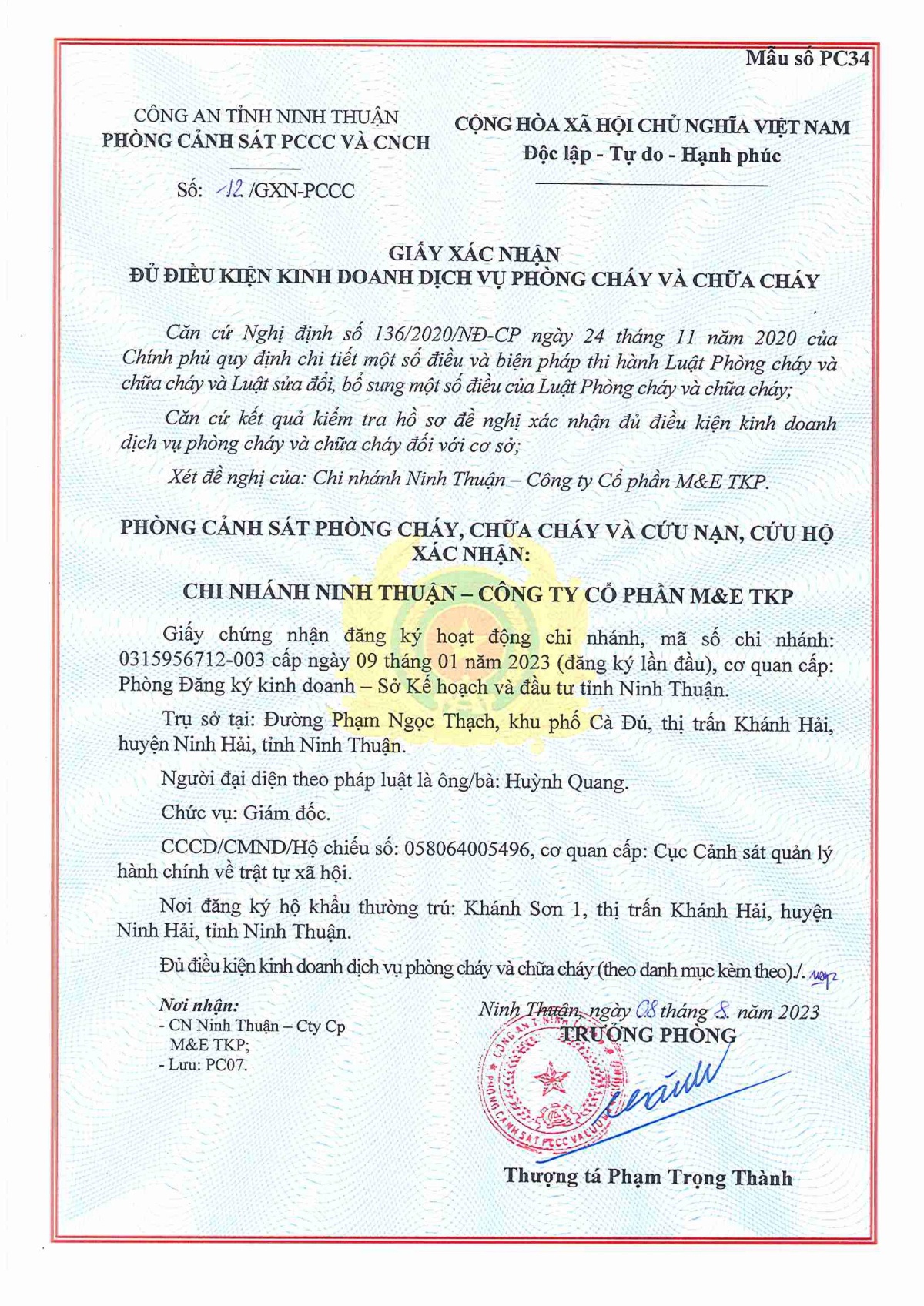 GIẤY XÁC NHẬN ĐỦ ĐIỀU KIỆN KINH DOANH DỊCH VỤ PCCC - CHI NHÁNH NINH THUẬN
