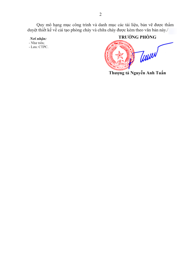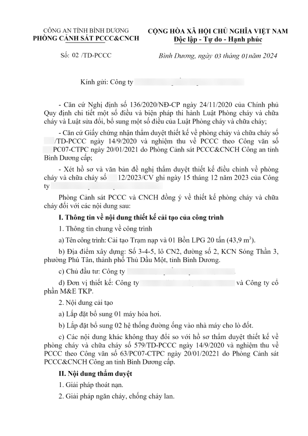 Dự án đã được Phòng Cảnh sát PCCC&CNCH - Công an Tỉnh Bình Dương đồng ý thiết kế phòng cháy và chữa cháy đối với các nội dung cụ thể tại văn bản dưới đây: