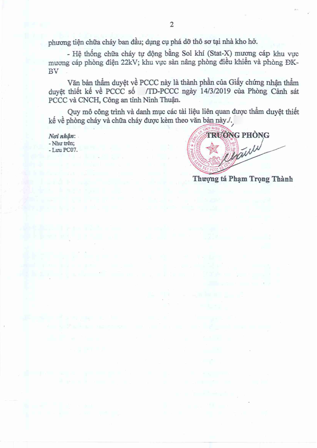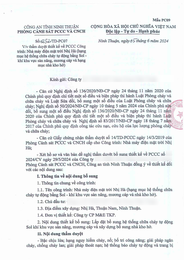 Dự án trên được Phòng Cảnh sát PCCC&CNCH - Công an tỉnh Ninh Thuận đồng ý về thiết kế PCCC với các nội dung tại văn bản dưới đây: